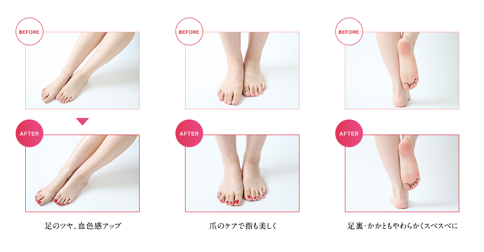 足のケアはずっと気になっていましたが、お店の人とはいえ見せるのは恥ずかしく、でも自分ではどうすればいいかもわからず悩んでいました。たまたま「足のエイジングケア」までできるお店があると知り、個室であれば、と勇気を出して行ってみたところ、大正解でした。爪がキレイになり足裏が柔らかくなっただけでなく、足全体が明るくすべすべになり、自分で見て触って大満足です!
